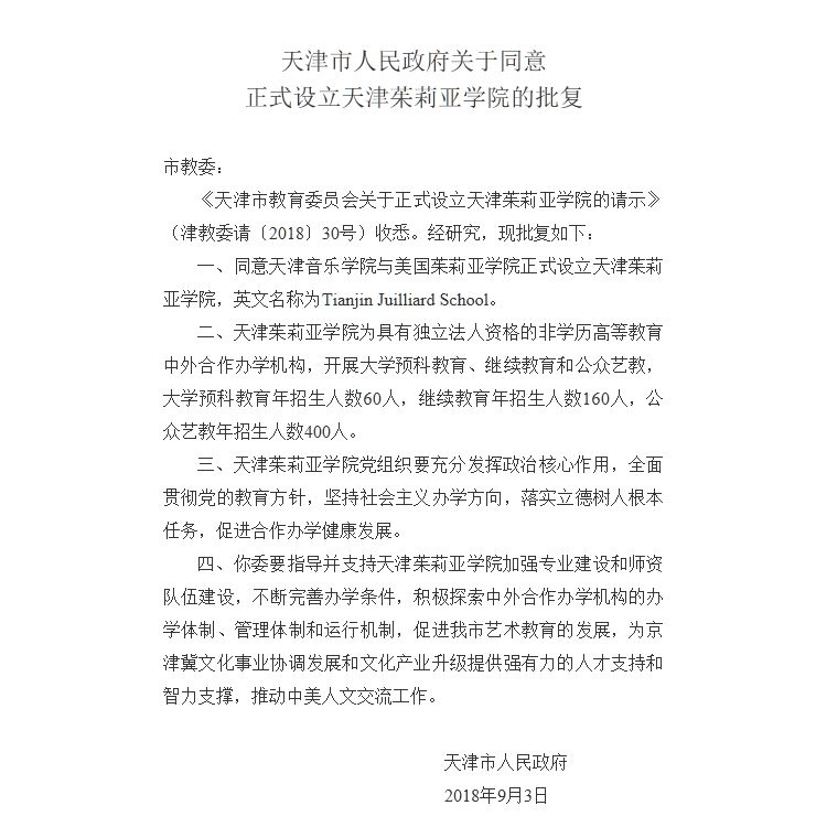 2018年9月3日,天津市人民政府同意天津音乐学院与美国茱莉亚学院正式设立天津茱莉亚学院的消息备受关注。