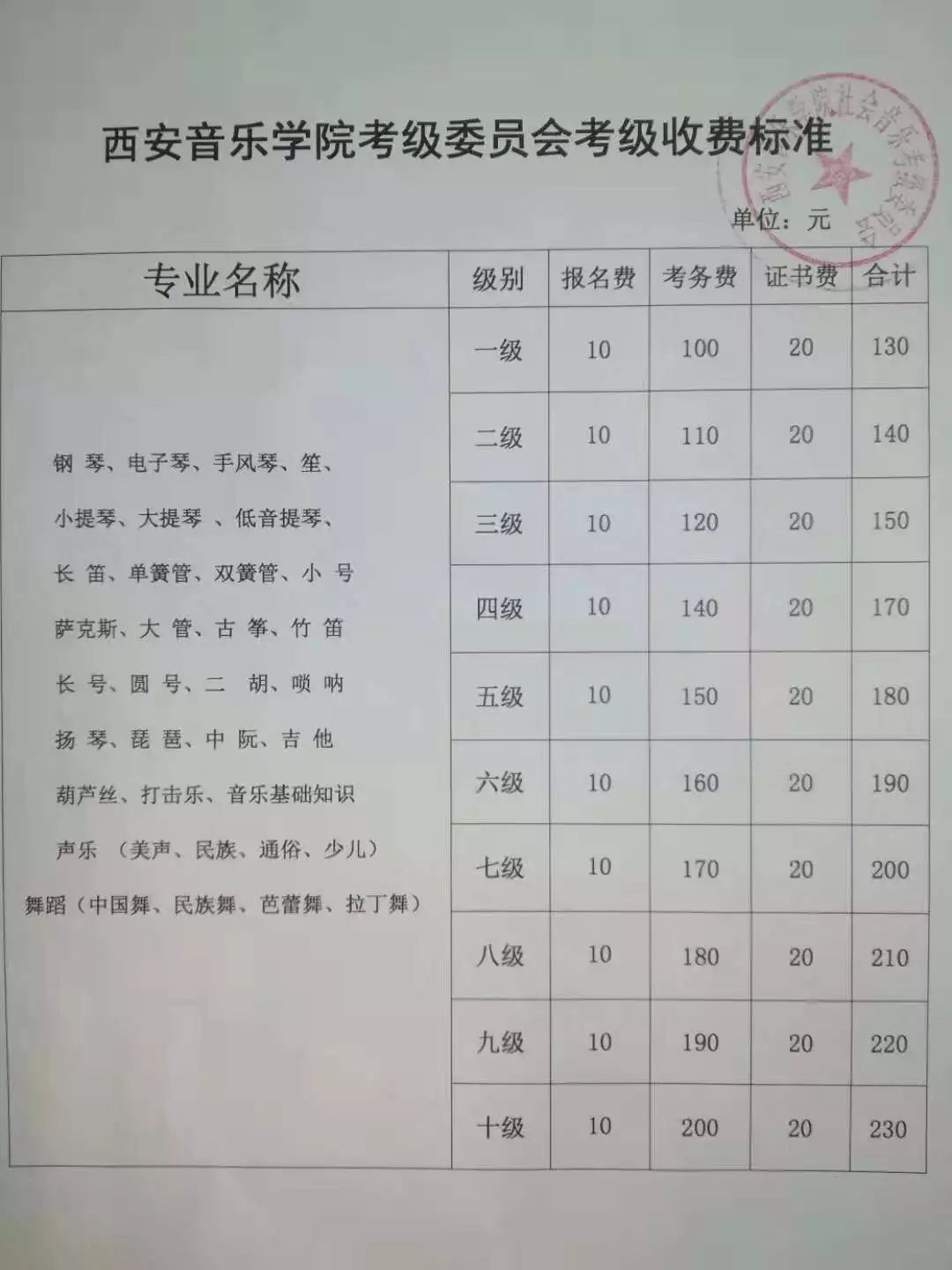 西安音乐学院培训考级中心专业设置及收费标准