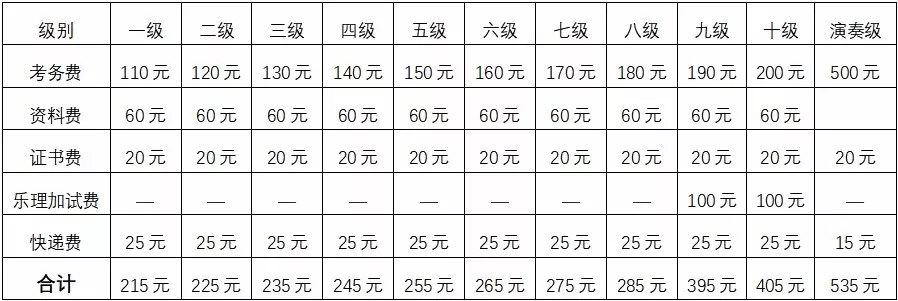 注:1、1-10级考级资料可自行选择购买与否,快递费为上海市内25元/2次,上海市外44元/2次;上海市内单次15元,市外单次22元。(快递费为邮局收取,上海市外快递费在报名系统中自动加收)。不合格或者缺考者不再退费。