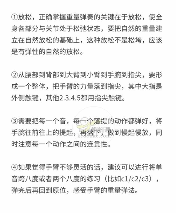 放松不是一个外在的动作,而应该是一个内在的感觉,大家要去体会这种放松的感觉,才能真正的将重量弹奏法弹好!