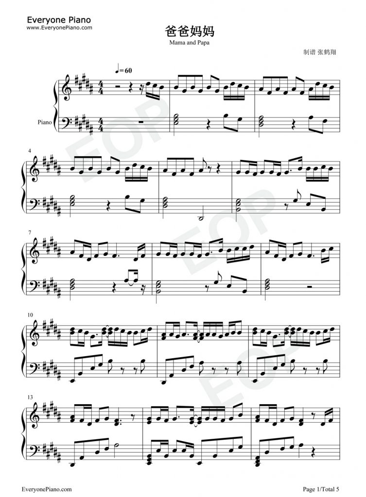 爸爸妈妈 钢琴数字简谱 – 李荣浩