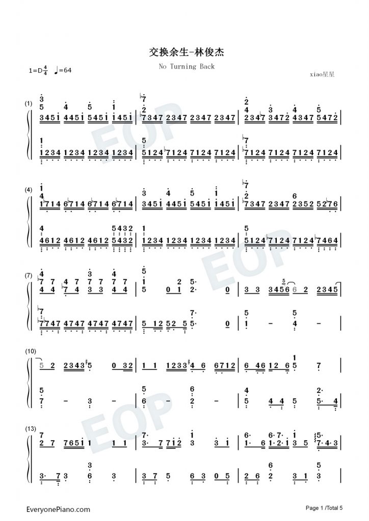 林俊杰最新单曲《交换余生》钢琴数字简谱