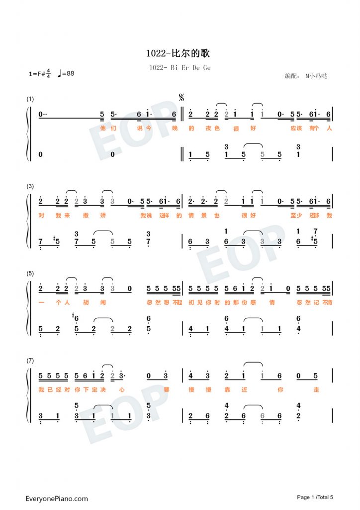 1022-比尔的歌 钢琴谱 -他们说今晚的夜色很好,应该有个人对我来撒娇-抖音热歌