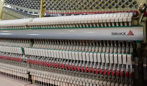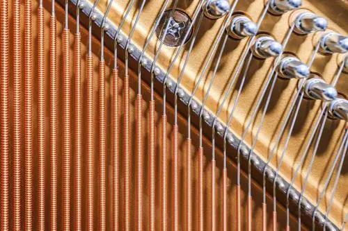 检查琴弦,打开上下门。第一要看裸钢弦在色泽上是否有明显的差别,钢弦以同一个厂家同一色泽为佳。第二是观察缠钢弦,近30条缠弦的紫铜丝色泽是否统一,离上方弦枕的裸钢弦尺寸是否均称。再下门观察,所有缠弦离弦桥最上面的第一个“马钉”,其尺寸是否均匀。有长短或不均匀说明制缠弦操作时工艺上有毛病。