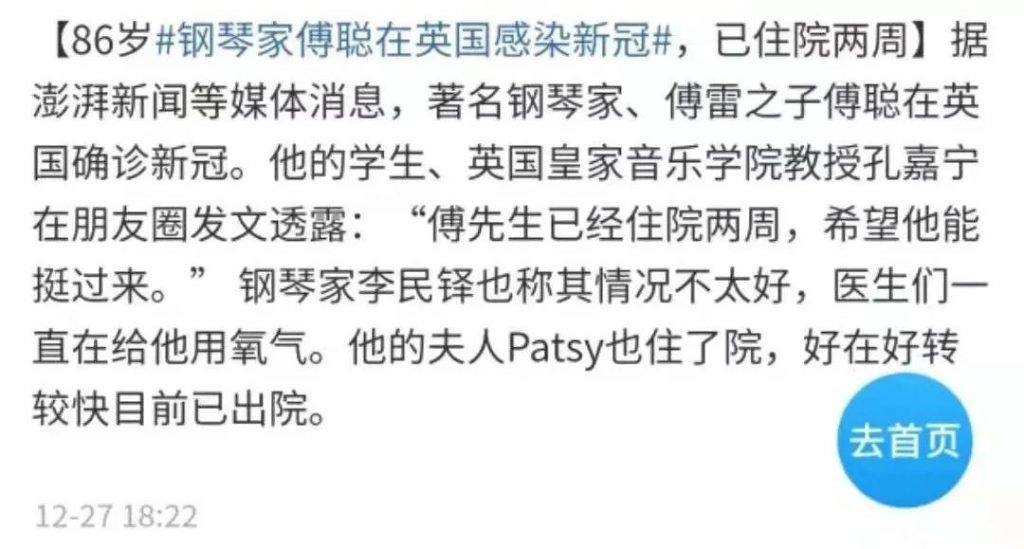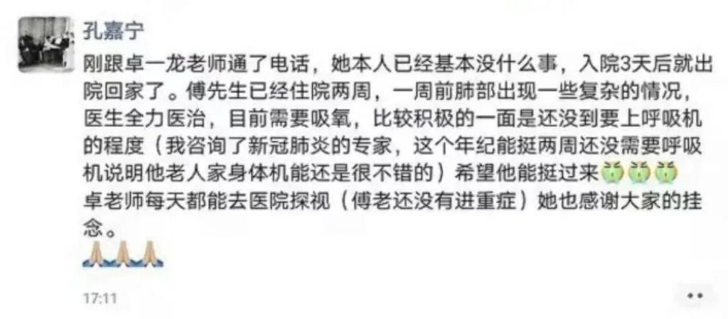 据傅聪的学生、钢琴家、英国皇家音乐学院中国籍教授孔嘉宁在自己的微信朋友圈分享了这一消息(他是和傅聪的妻子,钢琴家卓一龙确认):钢琴家傅聪日前在英国感染新冠,已经住院两周。虽然需要吸氧,但还没有需要上呼吸机···,希望他能挺过来。