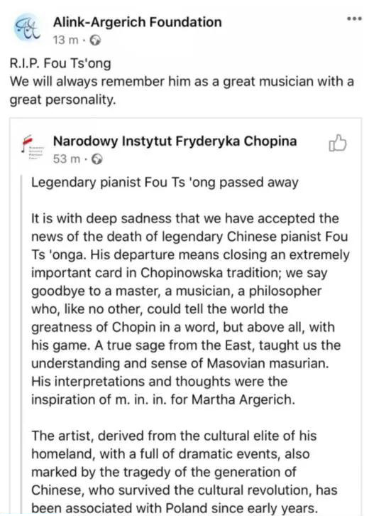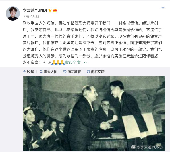 北京时间29日凌晨,钢琴家李云迪发文悼念傅聪:“刚收到友人的短信,得知前辈傅聪大师离开了我们,一时难以置信。缓过片刻后,我安慰自己,也以此安慰乐迷们:我始终相信古典音乐是永恒的,它流传了近千年,因为有一代代的音乐家们,才得以令它延续。现在我们有更好的保留声音的器皿,我相信它会更坚定地延续下去,直到它真正永恒。而那些离开了我们的大师们,他们在这个世界上留下了宝贵的声音,成为了永恒的一部分。我们也会追随先人的脚步,成为永恒的一部分。愿那永恒的美乐在天堂永远陪伴着您,永不寂寞!R.I.P”。
