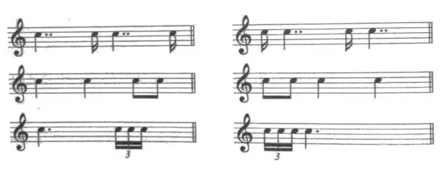 节奏型的改变可以是多种多样的,但有一点一定要注意,那就是任何节奏型的变化,都应当是一正一反成对练习的,而且每练习完成一对变节奏的练习,都要用正常节奏再练习一遍。