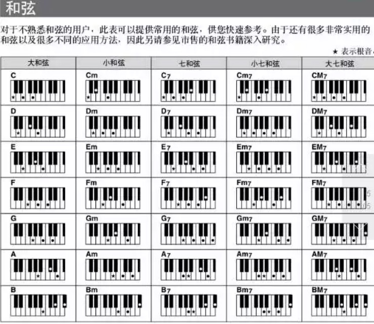 这是最基本的几个和弦,上面键盘上标记了星星★的是和弦的所谓根音,其他音用圆点●表示。大家可以看到规律,大和弦就是三个键,白键加黑键,按照从左到右,自己不算,弹第一个音后,隔四个键弹第二个音,再隔三个键再弹第三个音。小和弦则相反,即隔三再隔四。七和弦、小七和弦、大七和弦都是在这两种和弦基础上,按照隔多少个音的这种规则加上第四个音。仔细观察可以发现键盘位置的组合就那么几个,只是简单少数几个的排列组合而已,只要多练习并不难。