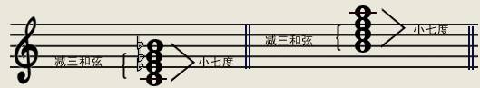 “根音”、“三音”、“五音”构成了减三和弦,从“根音”到“七音”是小七度,这个和弦叫“减小七和弦”,另外也称做“半减七和弦。”