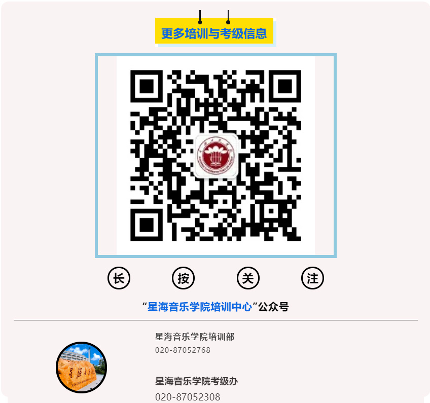 详情请关注“星海音乐学院培训中心”公众号,点击菜单“星海考级”查看考级简章。