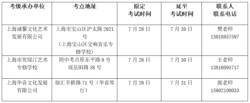 另,受台风“烟花”影响的浙江、江苏相关地区,请各考级承办单位切实加强安全防范意识,根据天气情况妥善进行暂停或延后安排。