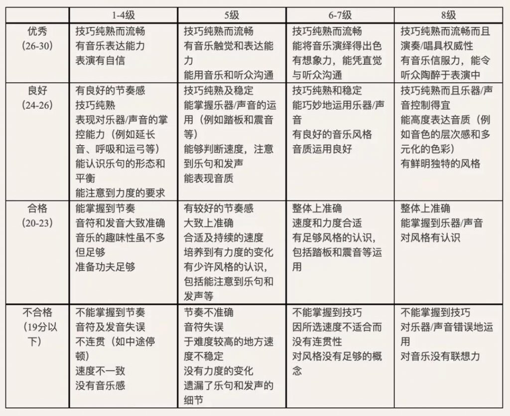 每种器乐的考试均需通过包括乐曲演奏、视奏、听力三个方面的评核。考试总分为150分,成绩分四等:130—150分为优异,120—129分为良好,100—119分为合格,100分以下为不合格。