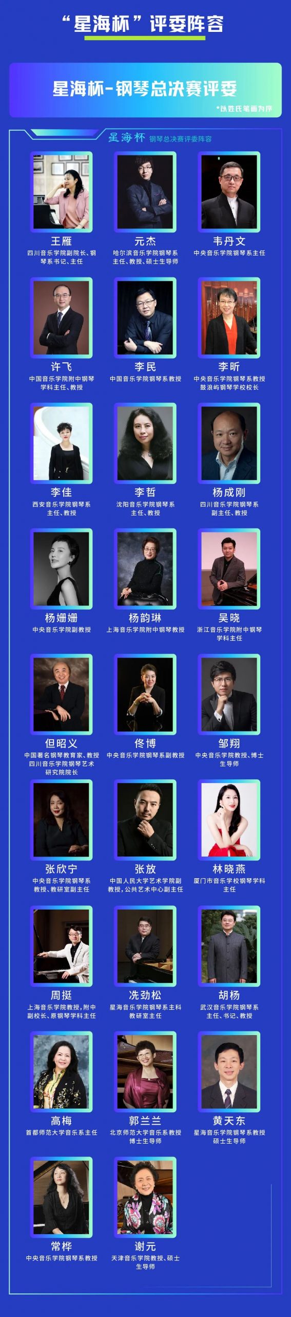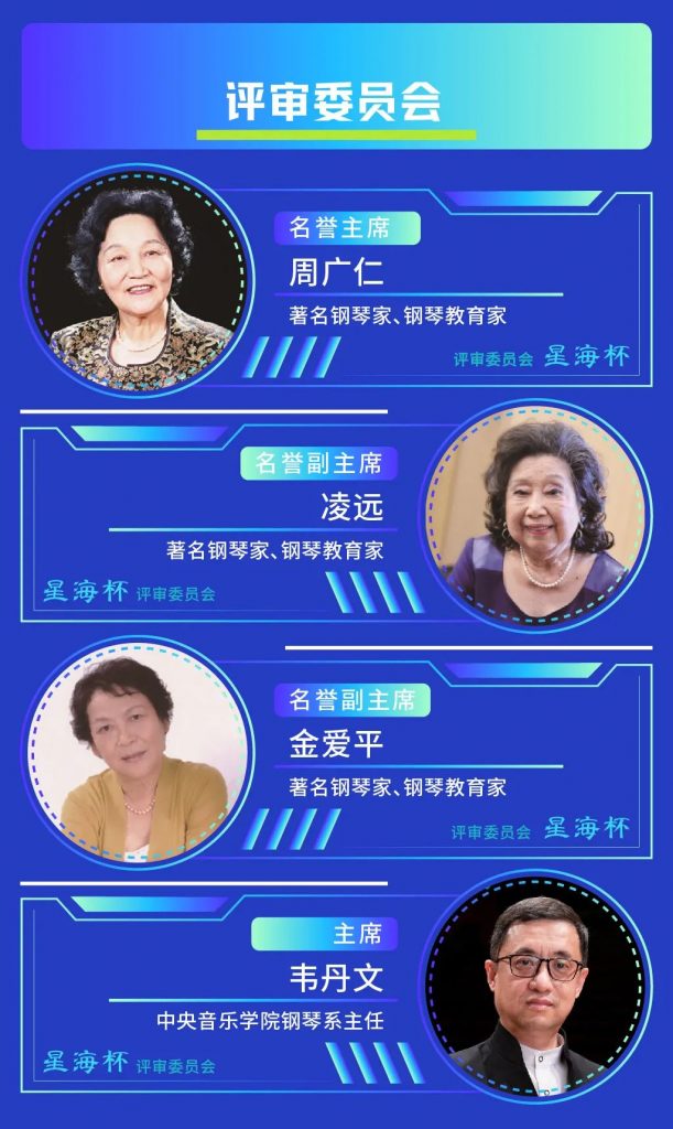 “星海杯”创始人之一,著名钢琴家、教育家周广仁教授担任过多届“星海杯”评委会主席或名誉主席,赛事评委均来自全国各地音乐院校的专家、教授。