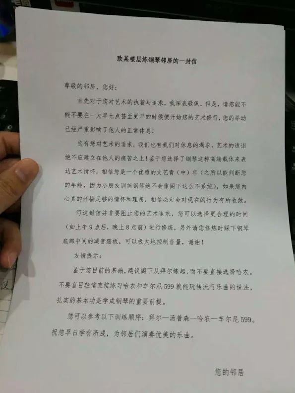 这封信近日被网友传上网,被赞为“教科书般的邻里提醒”,“因为其礼貌、专业,还讲情怀”。