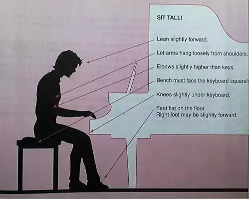 例如,身体前倾,当你放松状态下去弹奏,自然会身体前倾。再如,双脚平放地上,右脚可略微前放,这是为了在你弹奏过程中,你的双脚可以给你良好的支持,使你能够自由发力。下面是一张坐姿图,大家可以参考。