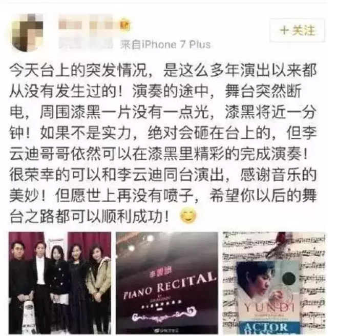 这位乐手说的“但愿再世上没有喷子”,指的是一年前云总在韩国首尔演出时遭遇的“车祸现场”,当时音乐圈一片哗然,所有矛头都指向李云迪。