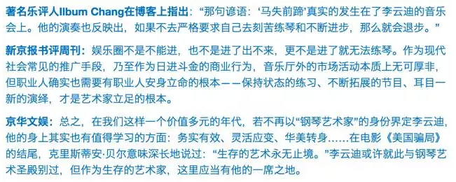 “如果一段曲子练了很多遍,盲谈真的很简单。但是这个曲子难度很大,而且,这个不是预先设计的环节,是一个演出事故,但是不受影响,依然这么流利……除了心理素质好,说他为这个的音乐会的准备,也做了很多,很用心的人。敬佩敬佩。”