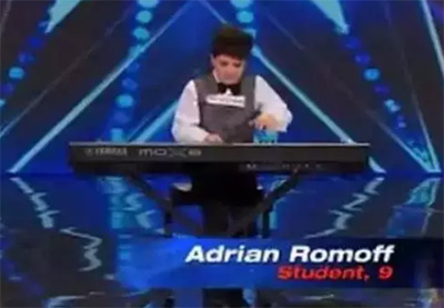Adrian Romoff是第九季美国达人秀(2014)的9岁钢琴神童,止步于四分之一决赛。Adrian Romoff来自佐治亚州亚特兰大,年仅9岁却已经连跳五级并希望在两年后(11岁)直升大学,此话一出让在场所有人惊呼连连!一说到他要表演弹钢琴就一脸骄傲!这位小男孩根本是用灵魂在弹奏钢琴的阿!最后连评审都说:“英国有哈利波特,而我们有你!”