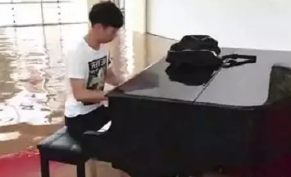暴雨使居民生活受到很大影响,然而这位男学生竟在没过半个小腿的大厅里弹奏了一首钢琴曲,着实向大家证明了什么叫真正的淡定。