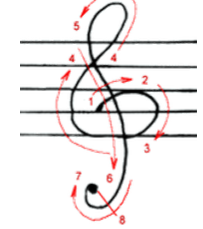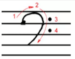 画这个谱号是从第二间开始的。从第二线开始向上紧靠着第三线顺时针往下画半个园,再紧贴着第一线画一个大于起口的圆形,然后,躲开这个圆形的开始的缺口,向上、向右、冲出第五线再向左,逆时针画一个小圆,回来,在第四线上定义。然后,从中间下来,穿过第三线、第二线,再穿过第一线,伸出尾巴来后,再左转,顺时针画半个小小的圆,结束时涂上一个小黑点点。这样,一个高音谱号就可以大功告成了。看起来复杂,实际画起来你会发现并不是很困难的。