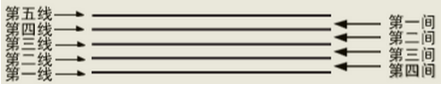 由于音符非常多,所以“线”与线之间的缝隙也绝对不能浪费的,也就是“线”与“线”之间的地方叫做“间”。这些间也是自下往上数的。同“线”一样。最下面的一间叫做“第一间”。往上数是第二间、第三间、第四间。