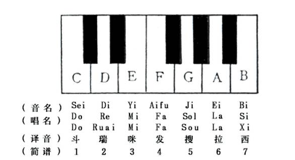 这七个音在钢琴上都是穿着雪白的衣服(白键子)。现在我们把这七个基本音的音名、唱名、译音、简谱记法全部在钢琴上做个对照。