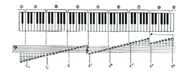 下面请看看五线谱在钢琴的键盘上相应的位置:
