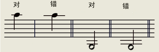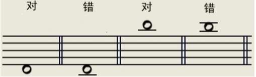2、在表示“上加间”和“下加间”的时候,不需要再把这个音符上面或下面的线画出来了。(如下图)