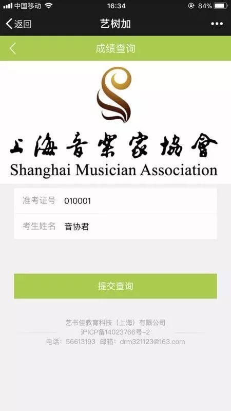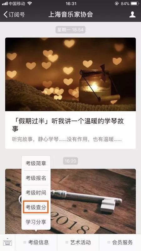 关注“上海音乐家协会”官方微信号,点击“考级信息”的“考级查分”选项;
