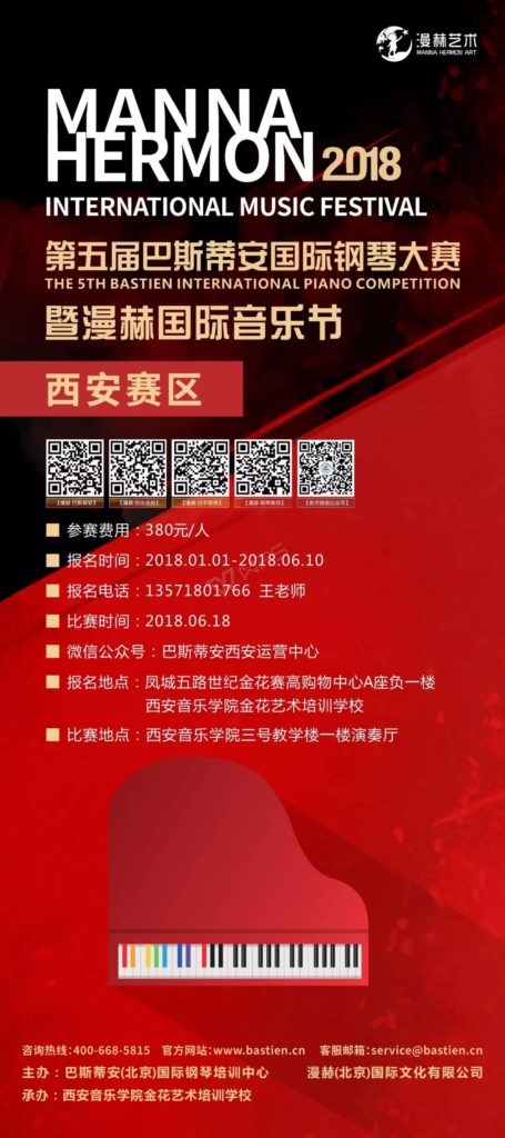 “2018 第五届巴斯蒂安国际钢琴大赛-暨漫赫国际音乐节”是国内唯一的教学型赛事,以向下扎根向上结果的人文主义精神和专业带动全人的教育理念为宗旨正式启动。本次活动是由巴斯蒂安(北京)国际钢琴培训中心、漫赫(北京)国际文化有限公司主办,由环球美星(北京)教育科技有限公司承办。为了丰富钢琴艺术教育的交流,让更多的琴童、老师以及钢琴爱好者全面提升音乐素养、演奏技能、艺术修养,本届大赛全面升级特此共分为四个类别进行比赛:1.巴斯蒂安、2.自由选曲、3.四手联弹、4.钢琴教师,特别在全国精英赛赛事当中增加了音乐素养考核作为附加分,全面展示赛事选手的综合能力。该赛事邀请多位国内外钢琴演奏家和教育家担任评委,秉着极大的公正性、权威性和广泛性来推广、普及高雅文化,丰富大众精神生活。并在全国总决赛及精英赛比赛当中邀请了国际国内著名音乐院校的钢琴大师们进行面对面的主题讲座、大师课、钢琴音乐会,让到场的每位选手和嘉宾都能近距离的感受音乐艺术的魅力。西安赛区由大赛组委会授权西安艾米熊教育科技有限公司承办。