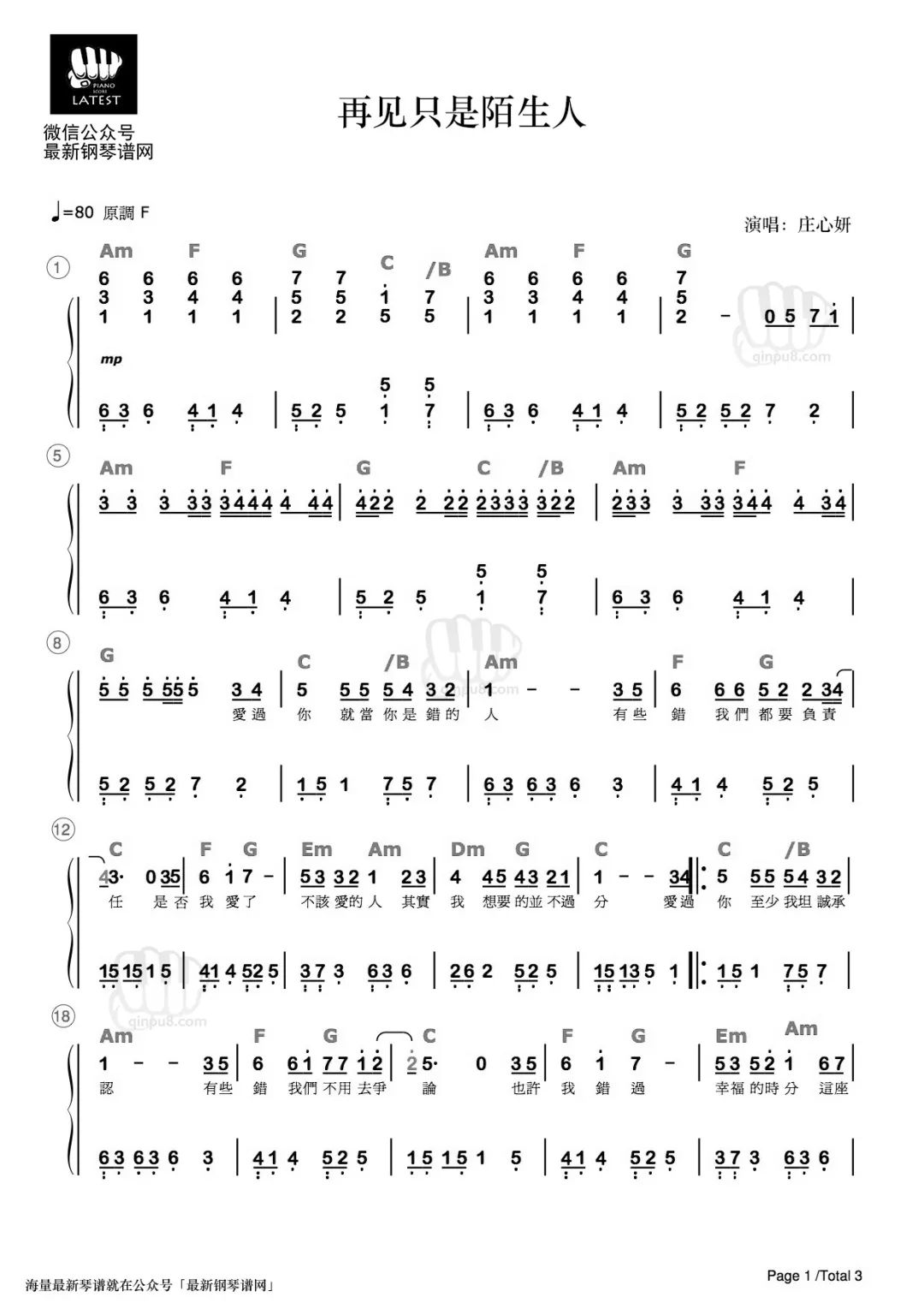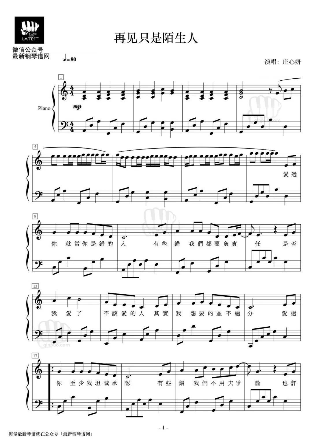 当前位置:首页 » 曲谱 » 《再见只是陌生人》钢琴谱|最近抖音很火的歌曲,是庄心妍的伤心情歌。