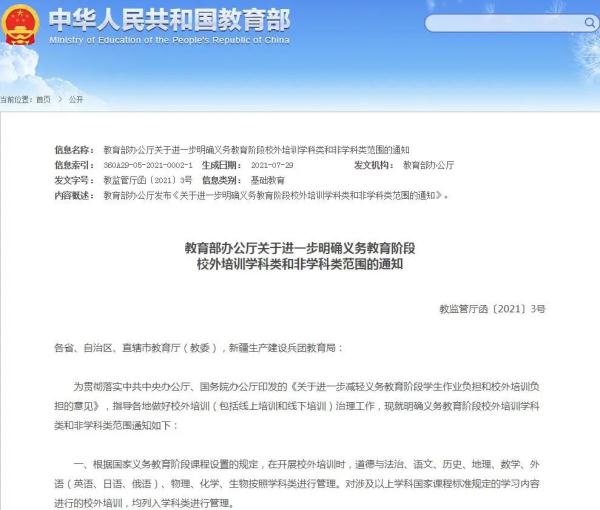 为贯彻落实中共中央办公厅、国务院办公厅印发的《关于进一步减轻义务教育阶段学生作业负担和校外培训负担的意见》,指导各地做好校外培训(包括线上培训和线下培训)治理工作,现就明确义务教育阶段校外培训学科类和非学科类范围通知如下: