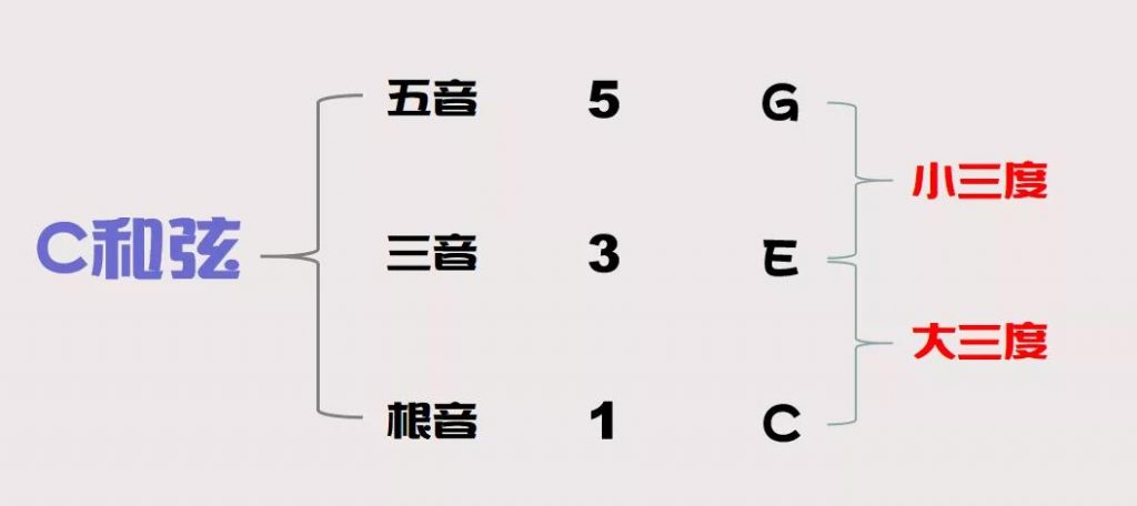 如C和弦,我们就以C为根音出发,往上叠加一个三度,就到了E这个音,也就是C和弦的三音,然后继续往上叠加一个三度,就到了G,也就是C和弦的五音(与根音相差五度)。