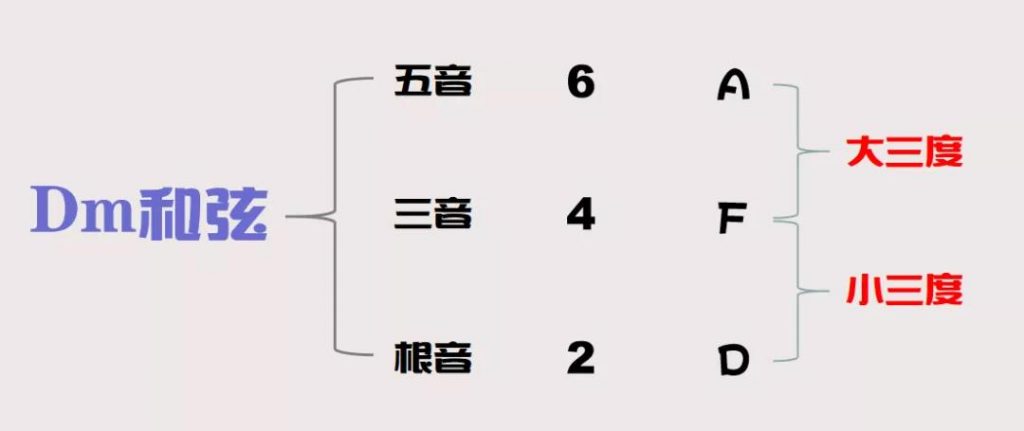 如果从D音出发构建三和弦,就会得到D F A三个音,我们能发现这个和弦根音到三音是小三度,三音到五音是大三度,这种我们称之为“小三和弦”(小+大)。