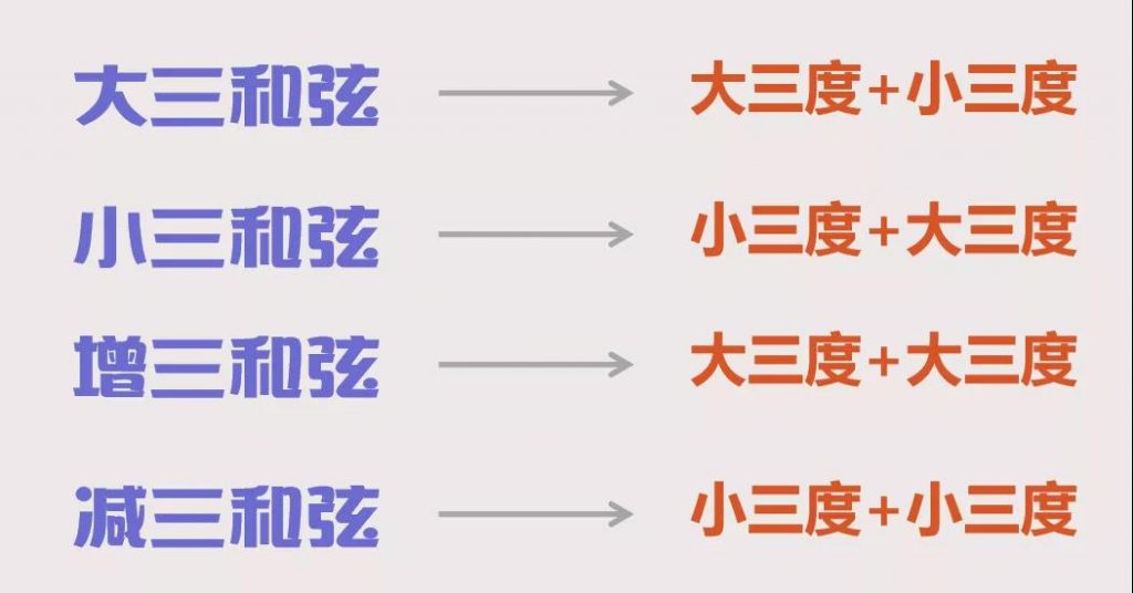 那么三和弦除了大三和小三之外,还有增三和弦和减三和弦,增三就是大三度+大三度,减三是小三度+小三度,不过这两种不是很常用,大家简单了解一下就行。