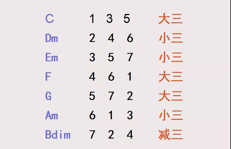 这样我们就可以知道,在自然大调里,一级和弦、四级和弦、五级和弦为大三和弦,二级、三级、六级为小三和弦,七级是减三和弦。(145大,236小,7减)