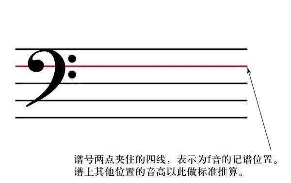 低音谱号:低音谱号也被称为f谱号,书写的时候从五线谱的第四线开始,第四线的音高是小字组的f。所以在写低音谱号时,要从第四线开头,两个点也是分别在第四线的上下。